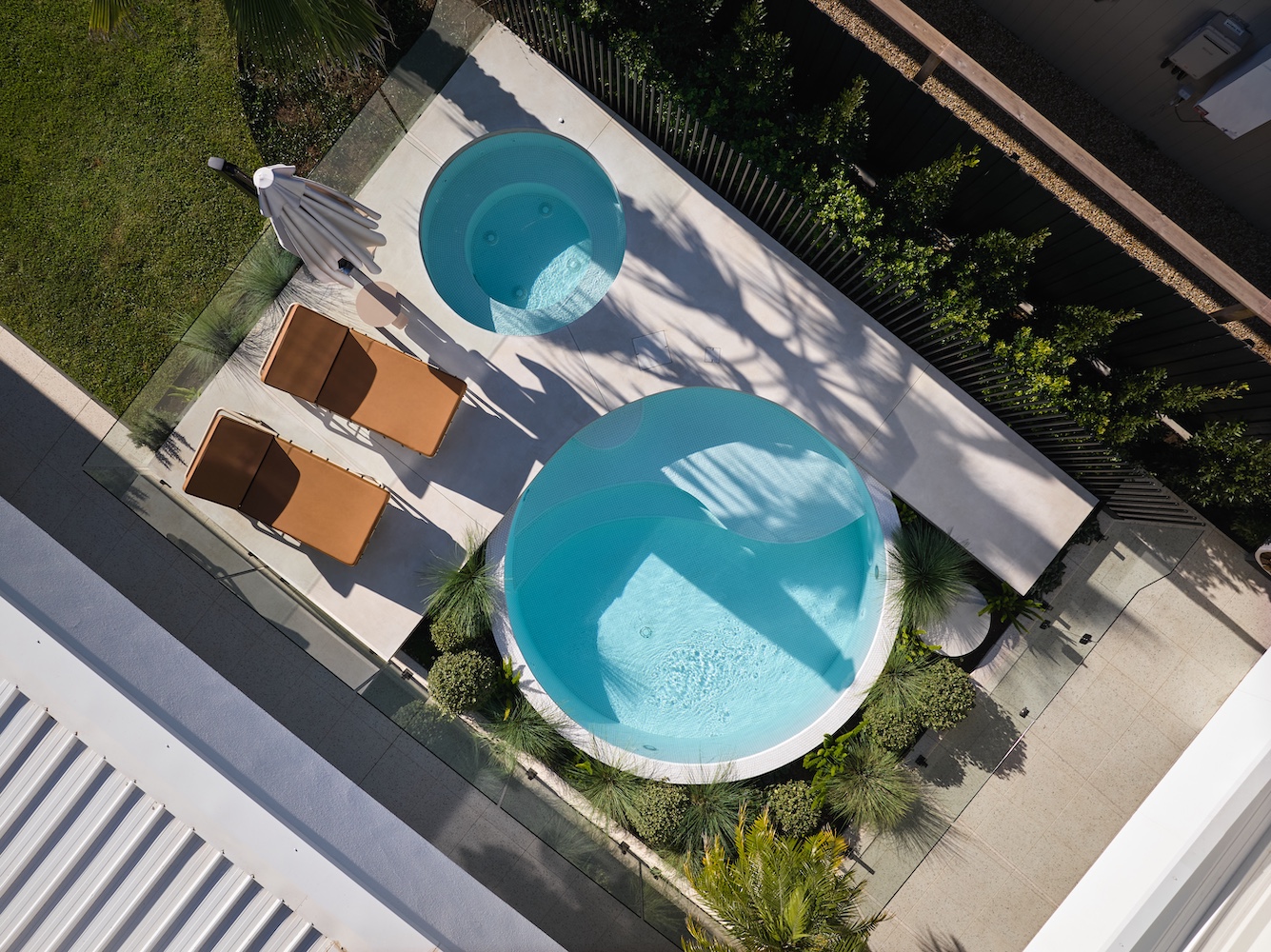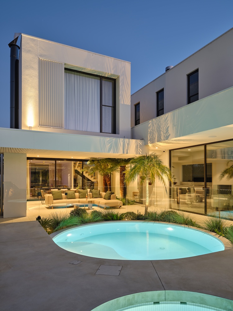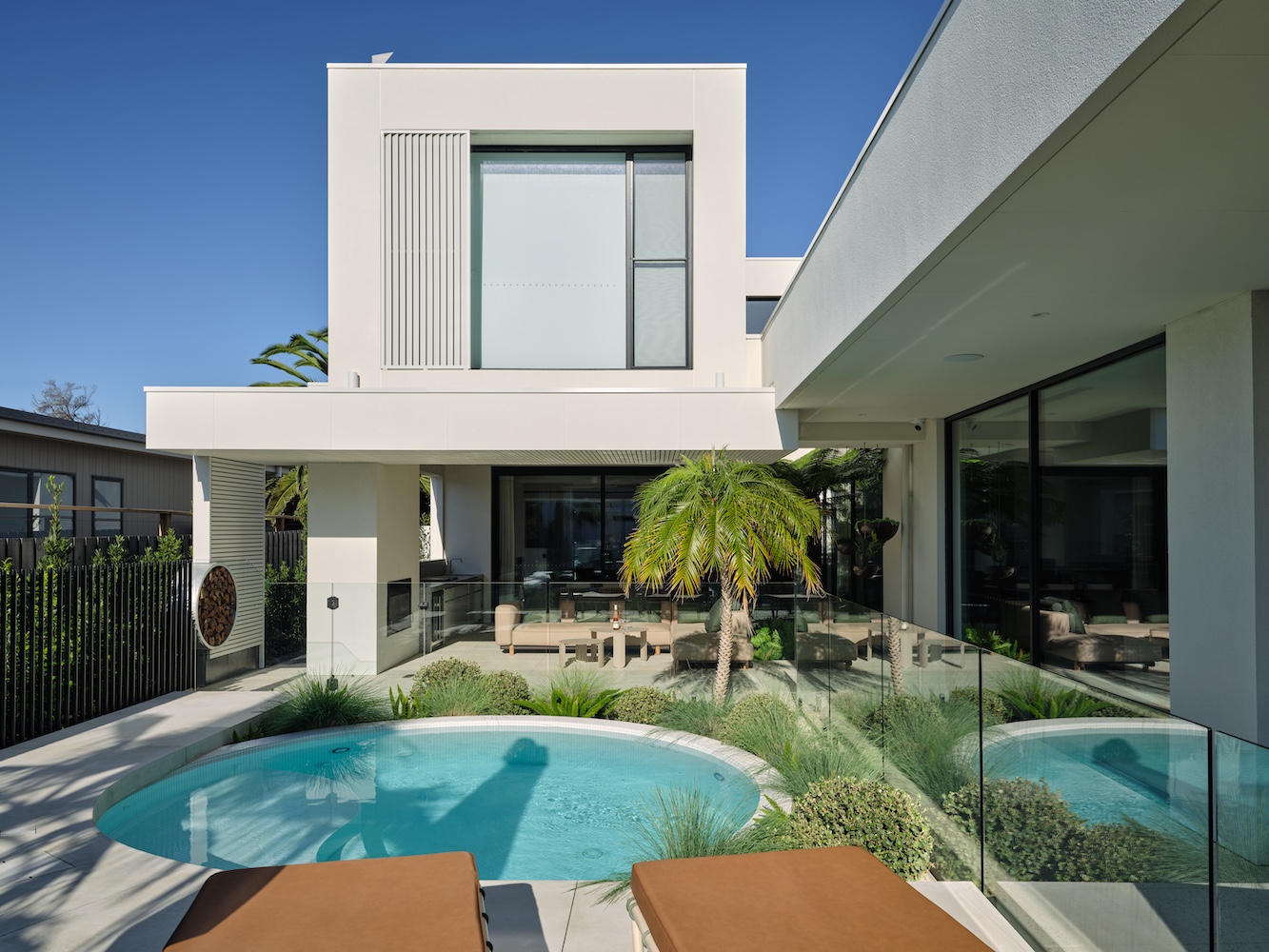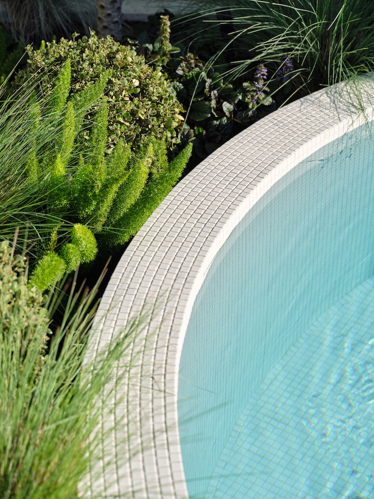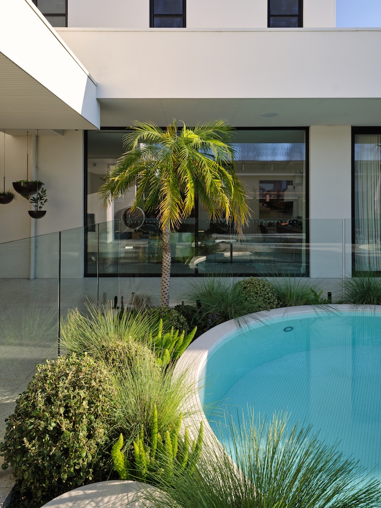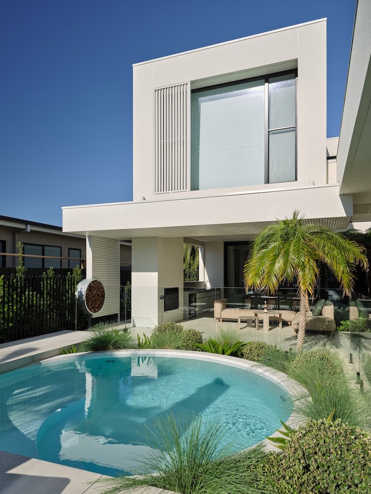 This exciting Mornington Peninsula beach side project encapsulates the design brief from the clients of a fun, relaxed yet highly sophisticated outdoor space that complimented the interiors of the home while softening the large built form of the home. The clients didn’t want a large pool so we created this highly functional and visually appealing round plunge pool with separate round spa to add a playful element to the now well defined, intimate courtyard just off the alfresco entertaining zone. Carefully selected coastal and exotic architectural planting soften and frames the pool scape and front facades of the home. The pool and garden are user friendly with minimal maintenance required to suit the occasional weekend use of the holiday home.