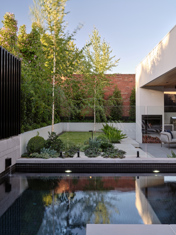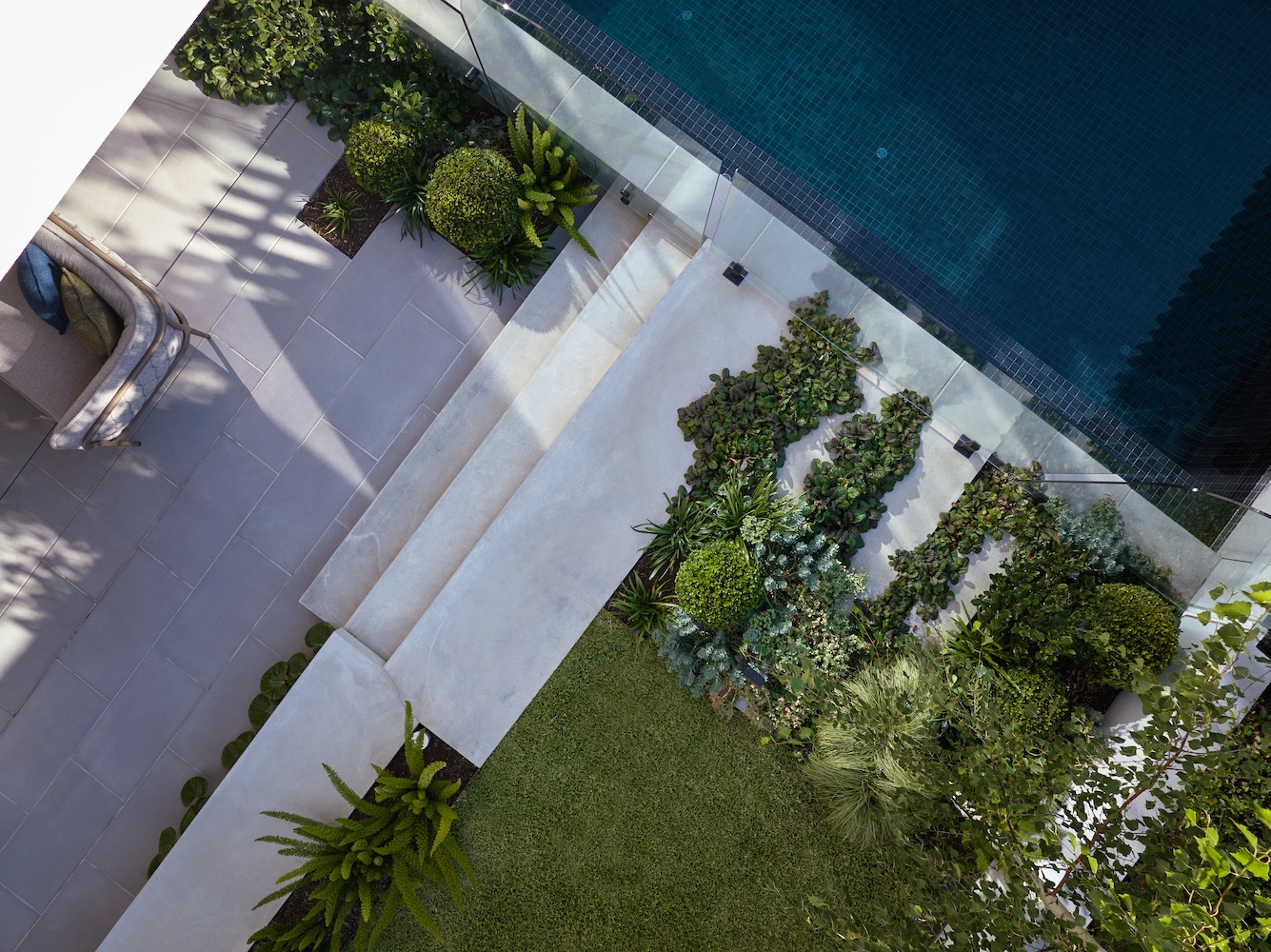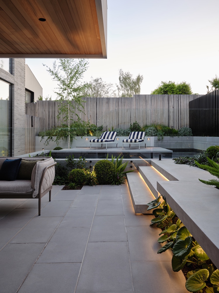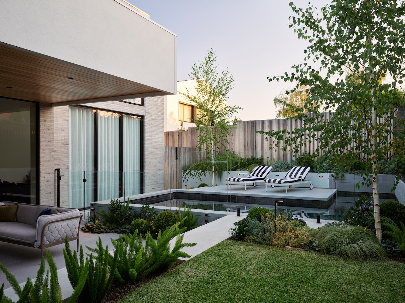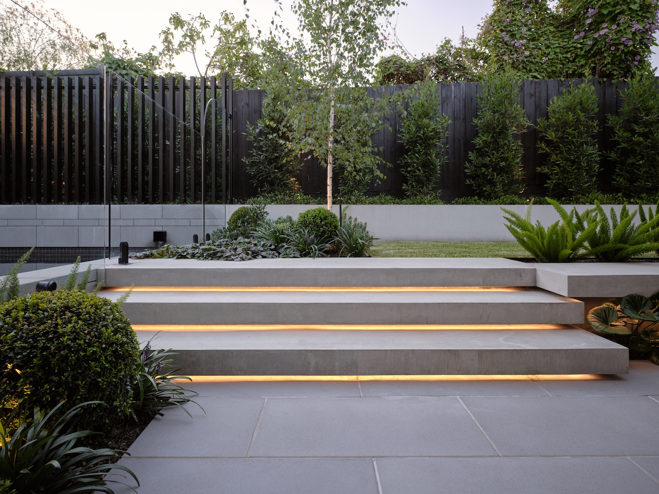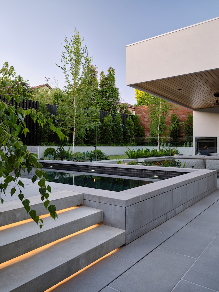 The design incorporates a raised pool, spa, sun lounges, and an elevated lawn that provides both play space for children and a sense of openness. Thoughtful level transitions reduced the scale of retaining walls while cleverly doubling as additional seating areas. The alfresco entertaining zone flows effortlessly into the garden, with lush underplanting and floating steps enhancing the connection between levels.